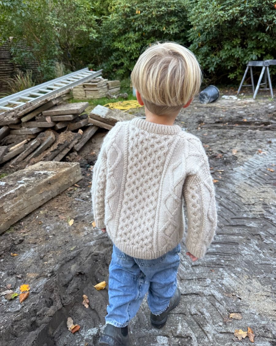 The Dagmar Sweater Junior is worked from the top down in cable and texture patterns. First the back yoke is worked flat, back and forth. Then each shoulder is worked separately, from stitches that are picked up and knitted along the top of the back yoke. Both shoulders are then joined to form the front yoke. The front and back yoke are joined at the underarms to form the body, which is worked in the round on a circular needle. The sleeves are worked from stitches that are picked up and knitted around the armholes. At the end, a folded neck edge is worked from stitches that are picked up and knitted along the neckline.