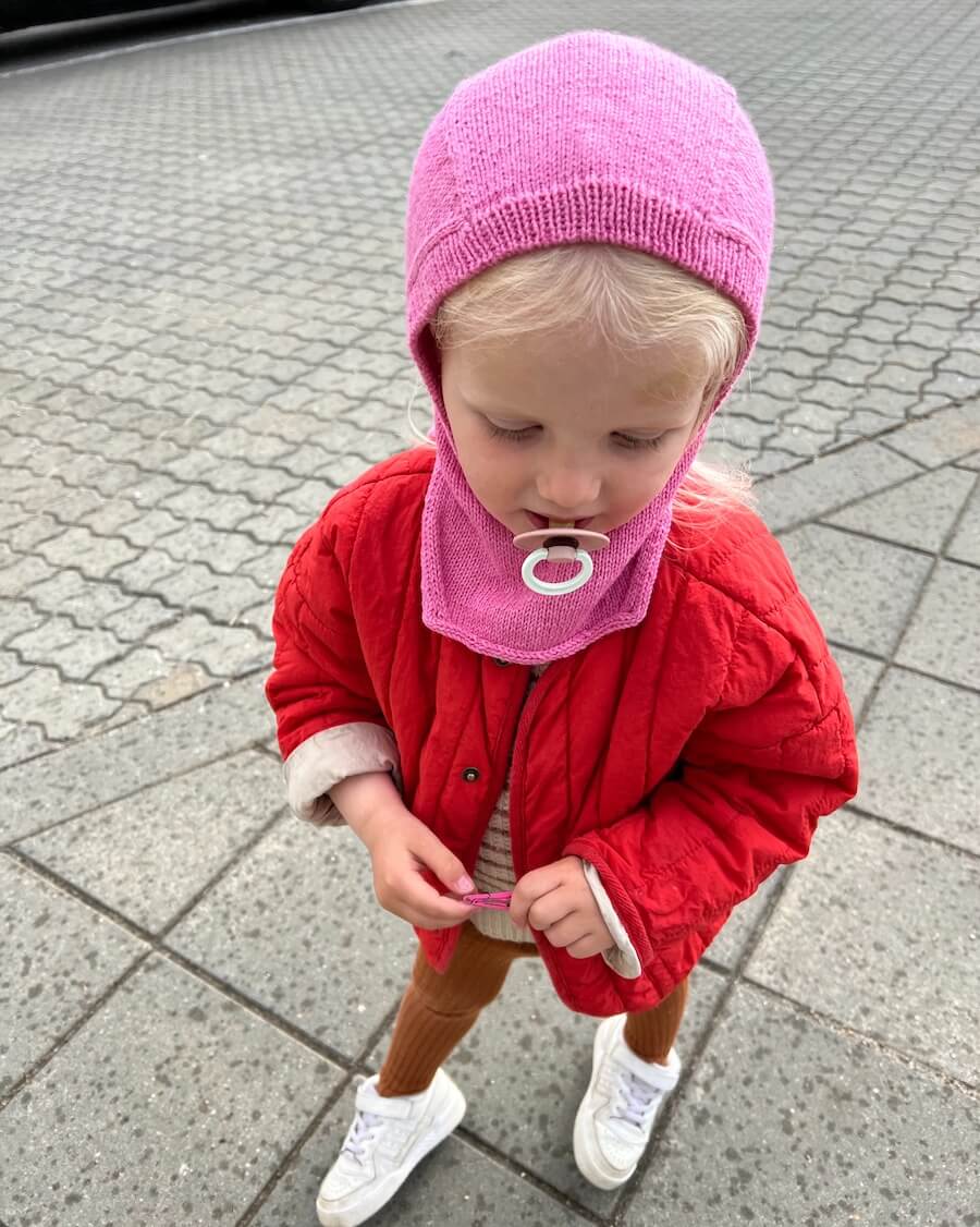 The Monday Balaclava is worked from the top down in stockinette stitch. First a square is worked for the top of the head. Then stitches are picked up and knitted along both sides of the square and decreases are worked along the opening for the face. The balaclava is then worked straight down and then joined to be worked in the round below the chin before it is split into front and back. At the end a rib edge is worked along the face opening and an i-cord edge is worked along the bottom edge.